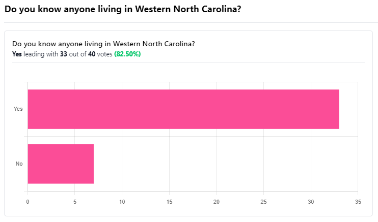 Another respondent shared the plight of a relative in Hendersonville: “My nephew and his family are safe, but their house is heavily damaged, now threatened by a mudslide. The road nearby is nearly destroyed.”